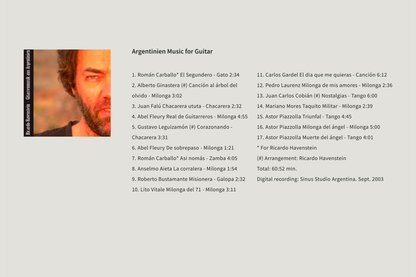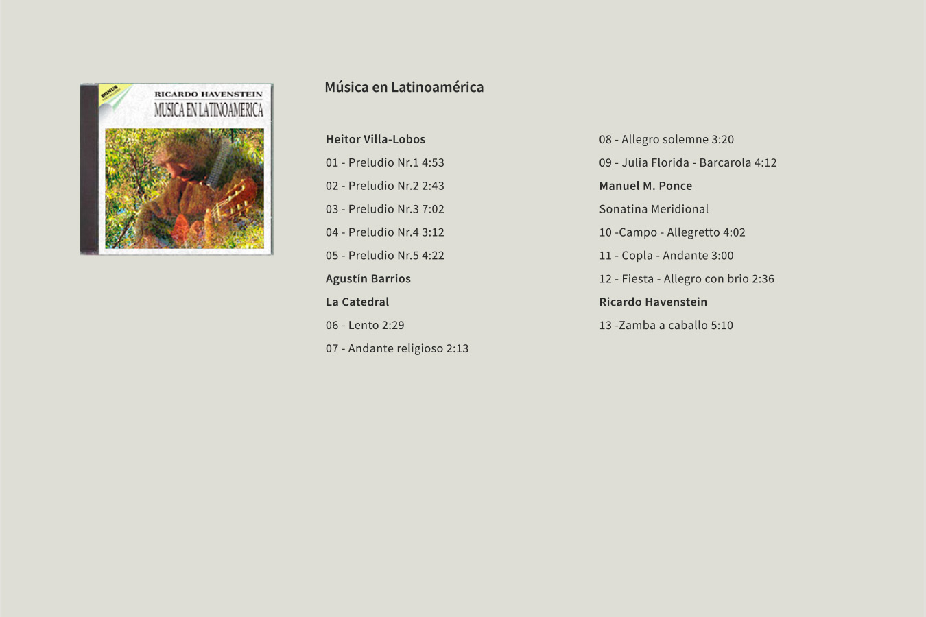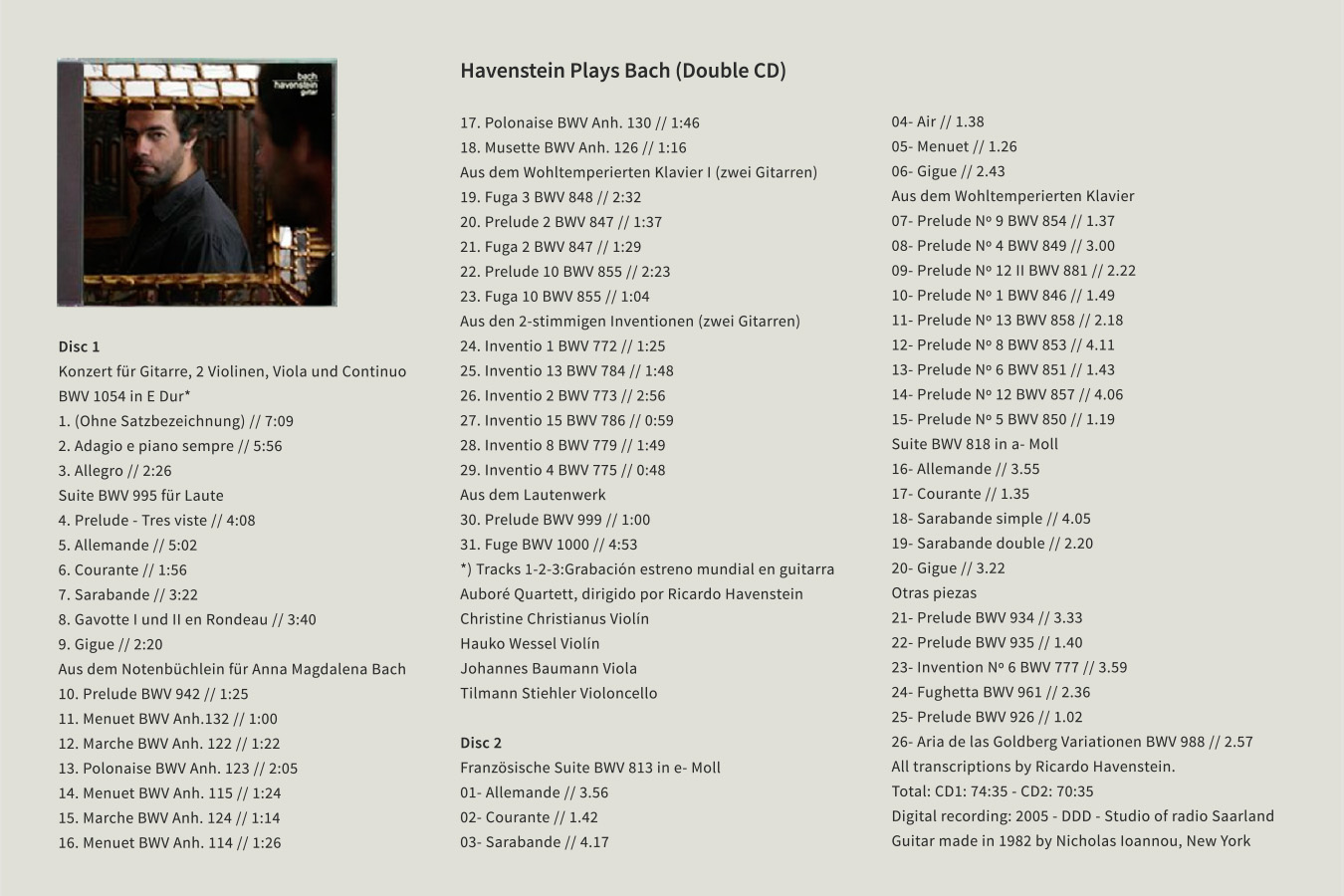 "I have greatly enjoyed Ricardo Havenstein's recordings, which extend the repertoire of the guitar in daring and interesting ways. They are the work of a natural born musician possessed of impeccable technique and great musical intelligence. I particularly admire his delineation of complex contrapuntal structures, so hard to do on the guitar, but in his hands seemingly effortless. I am proud to have guided him for a few years at the beginning of his career (although his subsequent development is a tribute only to his own great talent and sincere love of music!). I wish Ricardo Havenstein the great continued success he so richly deserves."