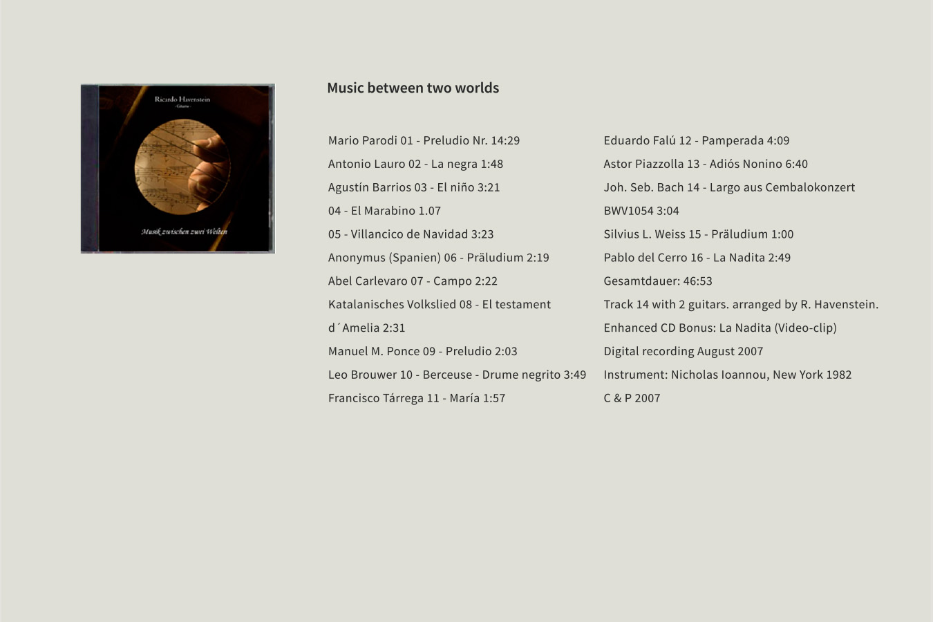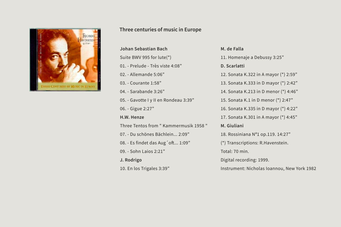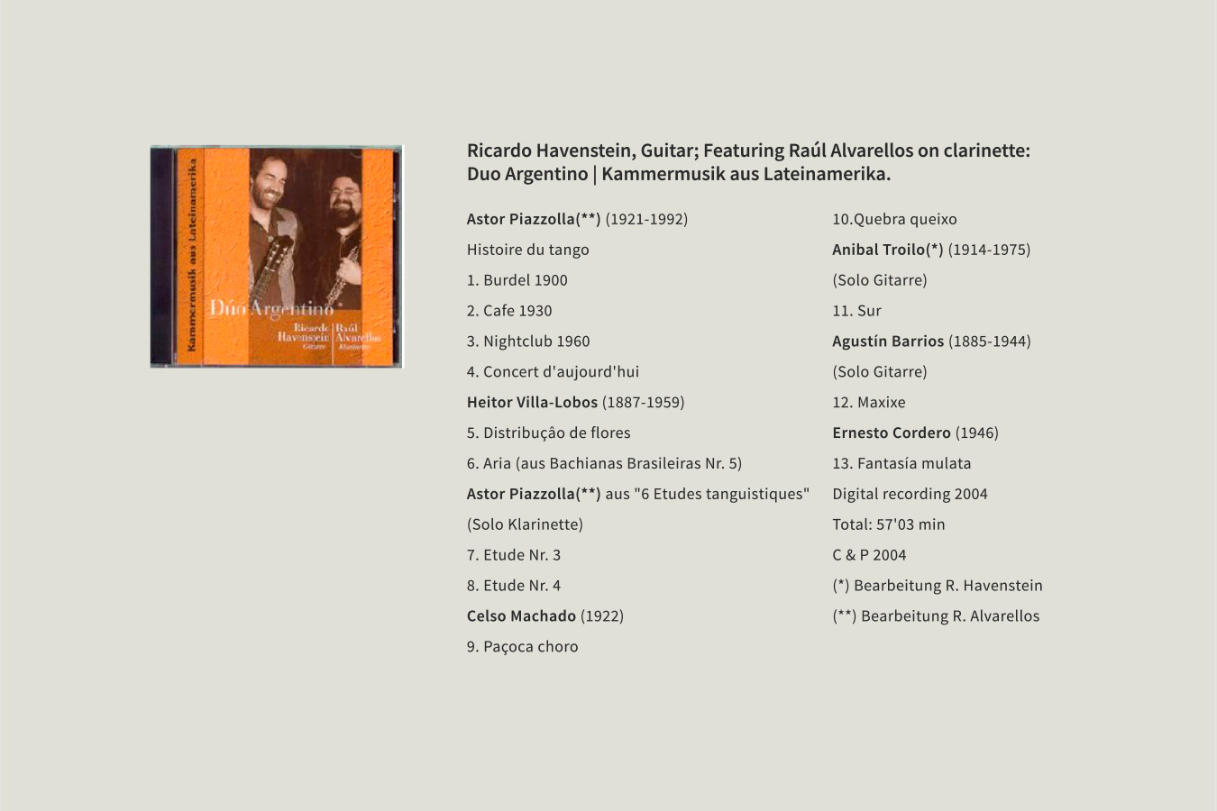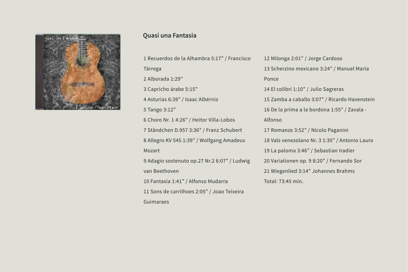 "I have greatly enjoyed Ricardo Havenstein's recordings, which extend the repertoire of the guitar in daring and interesting ways. They are the work of a natural born musician possessed of impeccable technique and great musical intelligence. I particularly admire his delineation of complex contrapuntal structures, so hard to do on the guitar, but in his hands seemingly effortless. I am proud to have guided him for a few years at the beginning of his career (although his subsequent development is a tribute only to his own great talent and sincere love of music!). I wish Ricardo Havenstein the great continued success he so richly deserves."